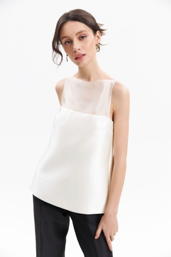 The elegant Luphia Top, crafted from soft taffeta and silk-like organza, is the perfect choice for a bold evening look. Its sleek lines and luxurious fabric gracefully accentuate the wearer's silhouette, while the white neck detail adds a striking touch, making the Luphia Top a true statement piece.
