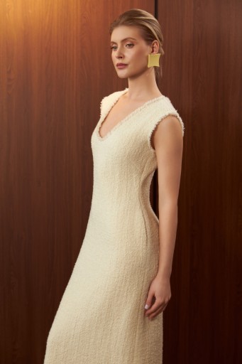 Long sheath dress featuring a structured taffeta sweetheart bust and a body crafted from soft Natural Cool Spandex. The combination of crisp texture and fluid stretch creates a refined, sculpted silhouette with a smooth, comfortable fit.